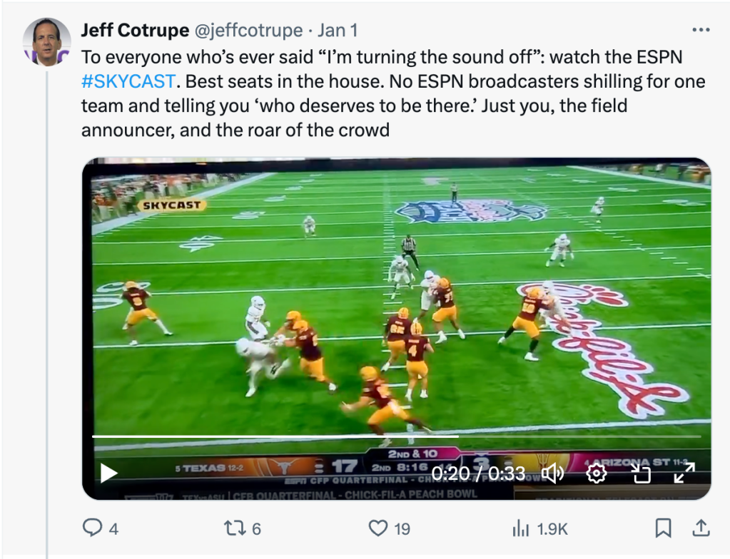 ESPN seems to find new ways daily to turn off fans and observers, including me, but when I do watch games on the network, my favorite way is now SkyCast. If ESPN offers SkyCast for a game, it appears on one of the ESPN channels adjacent to the main broadcast. (As does Command Center, a multi-screen enhanced version of the main broadcast.) To reprise my X post, on SkyCast you get the best seats in the house. No ESPN broadcasters shilling for one team and telling you ‘who deserves to be there.’ Just you, the field announcer, and the roar of the crowd.