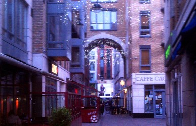 Passing the quaint little plaza shown at left, nestled between buildings near our hotel, I was charmed by its outdoor ambience and the “Christmas all year” lights twinkling overhead.