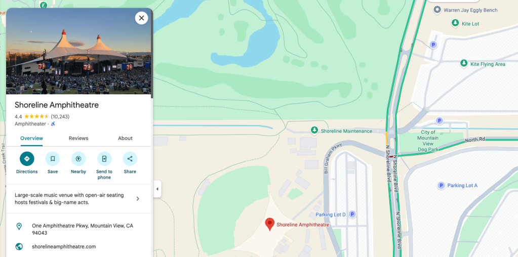 The first major landmark on my quest was the Shoreline Amphitheatre.